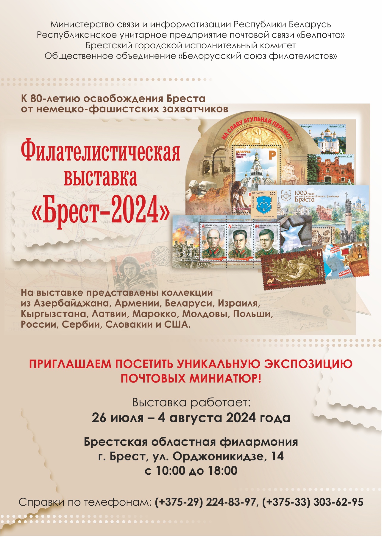 Все организационные вопросы, связанные с подготовкой и направлением экспонатов, просьба решать с председателем Брестского отделения ОО «Белорусский союз филателистов» Туриным Леонидом Григорьевичем (тел. +375 29 224 83 97 (Viber); e-mail: Адрес электронной почты защищен от спам-ботов. Для просмотра адреса в вашем браузере должен быть включен Javascript.) и членом правления ОО «БСФ» Андреюком Валерием Николаевичем (тел. +375 33 303 62 95 (Viber); e-mail: Адрес электронной почты защищен от спам-ботов. Для просмотра адреса в вашем браузере должен быть включен Javascript.).